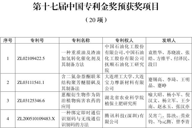 20件发明、实用新型专利获得中国专利金奖,5件外观设计专利获得中国外观设计金奖,507件发明、实用新型专利获得中国专利优秀奖,57件外观设计专利获得中国外观设计优秀奖。11月27日,国家知识产权局印发《关于第十七届中国专利奖授奖的决定》,其中公布了第十七届中国专利奖获奖名单。