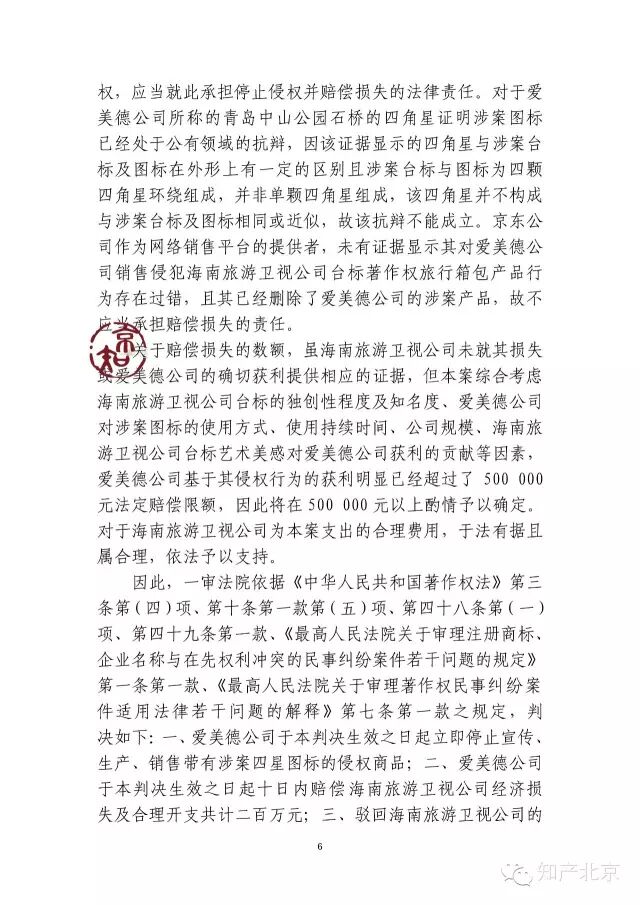 一审法院判决:爱美德公司立即停止宣传、生产、销售带有涉案四星图标的侵权商品,爱美德公司赔偿海南旅游卫视公司经济损失及合理开支共计二百万元。