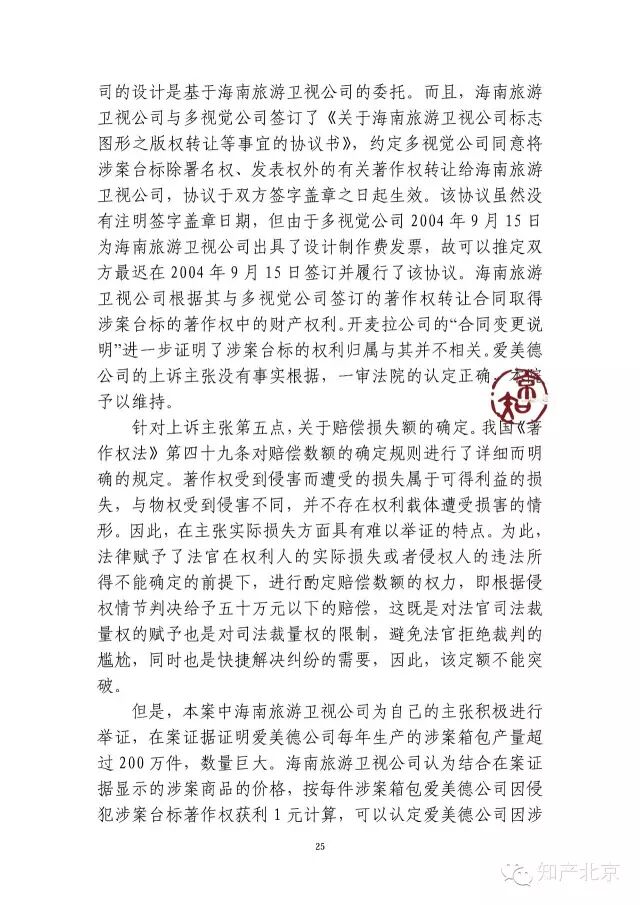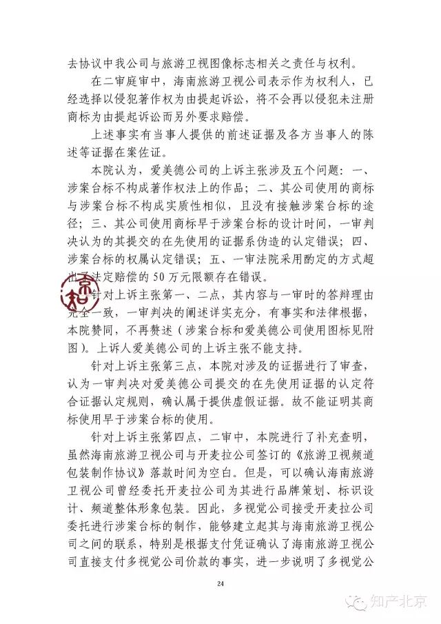 裁判结果:北京知识产权法院经审理认为,爱美德公司所使用的图标与涉案台标构成实质近似,侵犯了原告的著作权,爱美德公司提交的在先使用证据属于提供虚假证据,不能证明其商标使用早于涉案台标的使用。一审确定爱美德公司赔偿海南旅游卫视公司经济损失及合理费用二百万元并无不当。判决驳回上诉,维持原判。