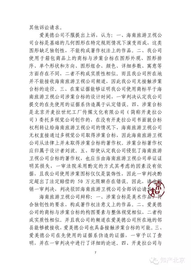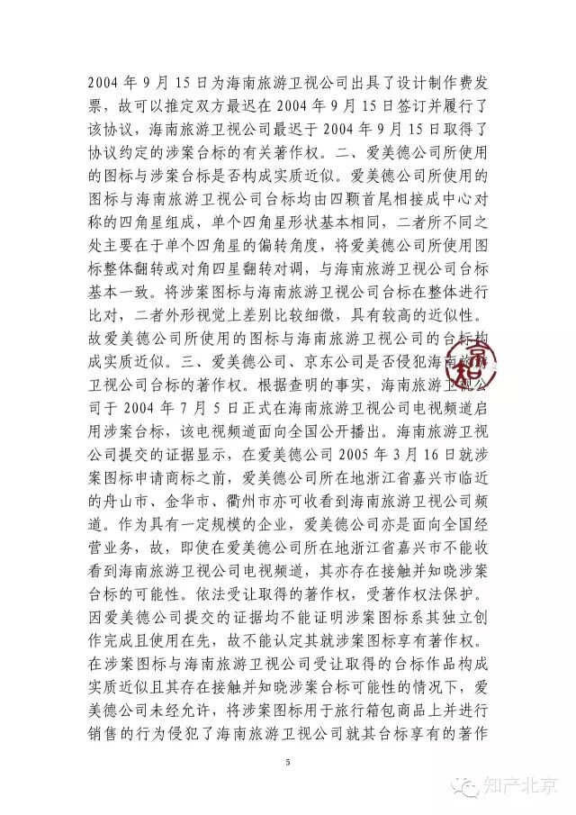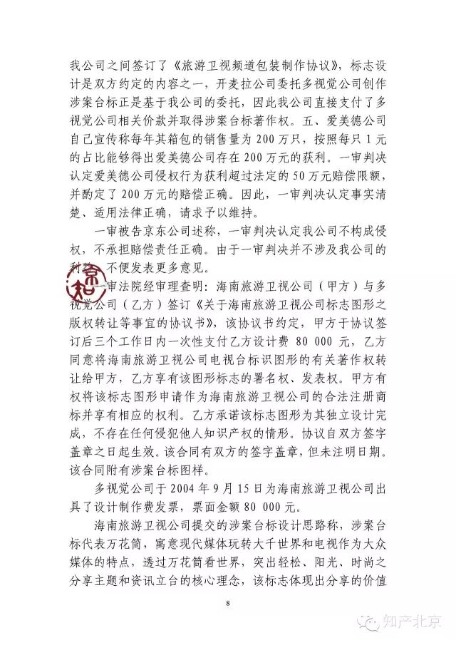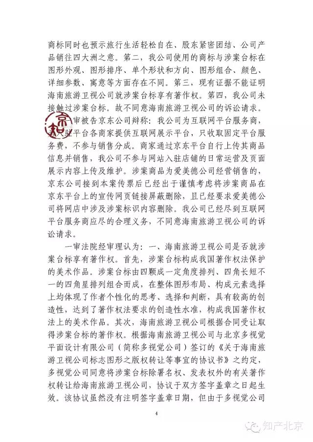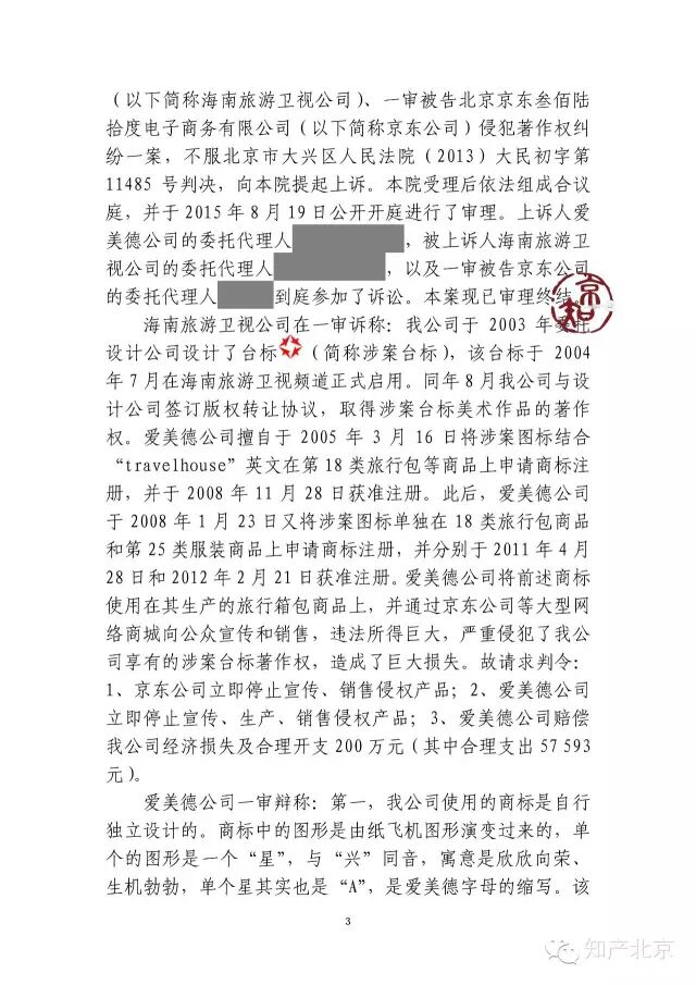 基本案情:海南旅游卫视公司是涉案台标的著作权人。爱美德公司擅自将涉案图标结合“travelhouse”英文注册为商标,在其生产的旅行箱包商品上使用,并通过京东公司等大型网络商城向公众宣传和销售。海南旅游卫视公司向一审法院起诉,要求爱美德公司和京东公司停止侵权,赔偿损失。