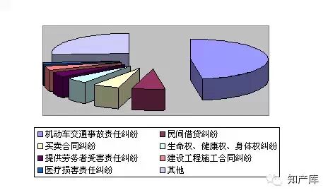 法院审理中对外委托司法鉴定的案件具体类型主要为人身损害赔偿纠纷类案件。我们从审判系统中抽取了2013年涉及对外委托司法鉴定的9283件民商事案件,其中最多的是人身损害赔偿纠纷,占比58.60%。之后依次为:金融纠纷占9.26%;买卖合同纠纷占8.11%;建设工程纠纷占5.13%;婚姻家庭纠纷占3.15%。就具体案由而言,机动车交通事故责任纠纷案件几乎占据了鉴定案件的半壁江山,占比为47.63%(图表五)。