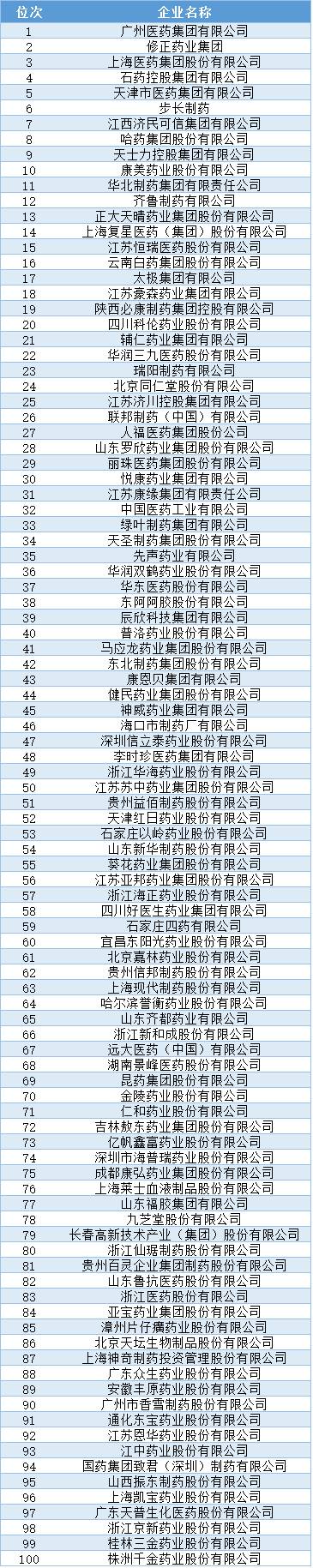 本次百强榜中,广州医药集团有限公司、修正药业集团、上海医药集团股份有限公司、石药控股集团有限公司、天津市医药集团有限公司位居榜单的前五名。值得一提的是,广药集团再次蝉联冠军宝座。
