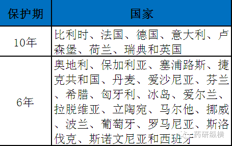 于2005年11月20日之后在欧洲上市的各药品,其保护期以首次获得许可上市之日起计,保护期为10年。对获批新增适应证的药物,其保护期将延长至11年。