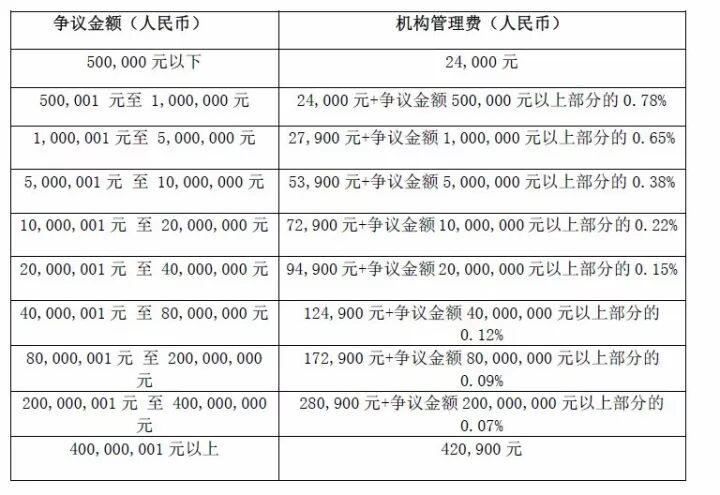 2.机构管理费包含管理案件的投资争端解决中心或香港仲裁中心指定的案件秘书的工作报酬以及使用仲裁委员会开庭室的费用。