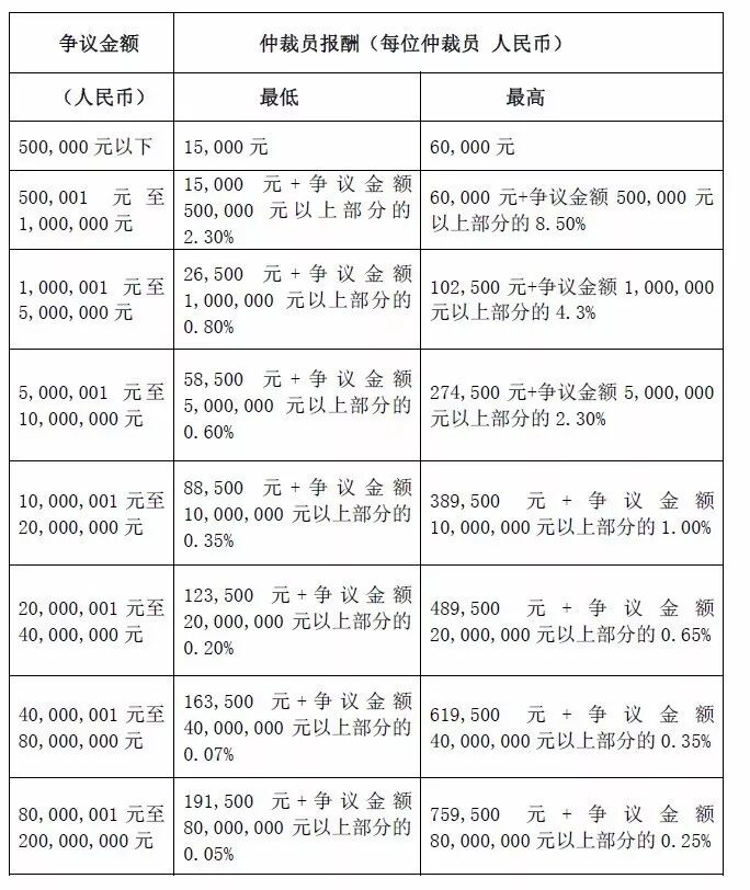 2.除非本仲裁员报酬表另有规定,仲裁员的报酬,由仲裁委员会根据案件的具体情况按照该表确定并由管理案件的投资争端解决中心或香港仲裁中心收取;仲裁员的费用包括仲裁员在从事仲裁活动时产生的全部的合理的实际开支。